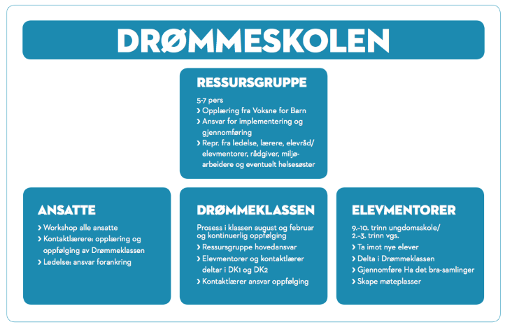 Hjertet i Drømmeskolen er elevmentorene. Det er en gruppe elever som får i oppdrag å bidra til at medelever føler seg sett og ivaretatt på skolen. Viktige oppgaver for elevmentorer er: