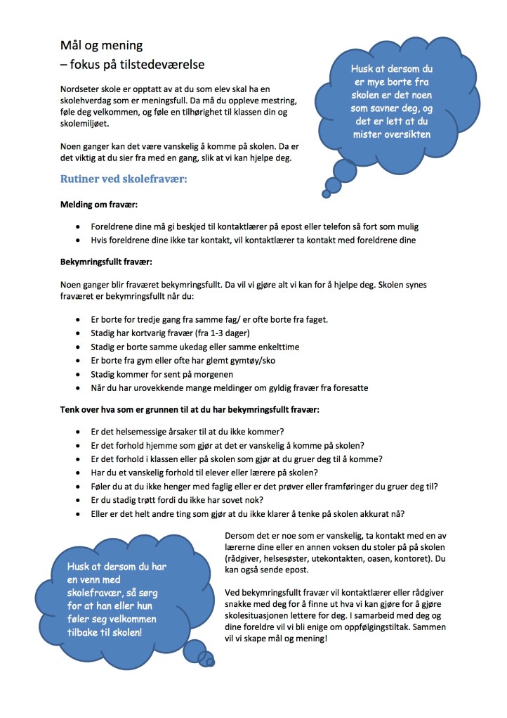 Høyt fravær er en indikasjon på at enkelte elever har litt vansker med dette, og vi vil derfor ha et ekstra fokus på rutiner rundt høyt fravær.  Her kan du se vår fraværsplakat: